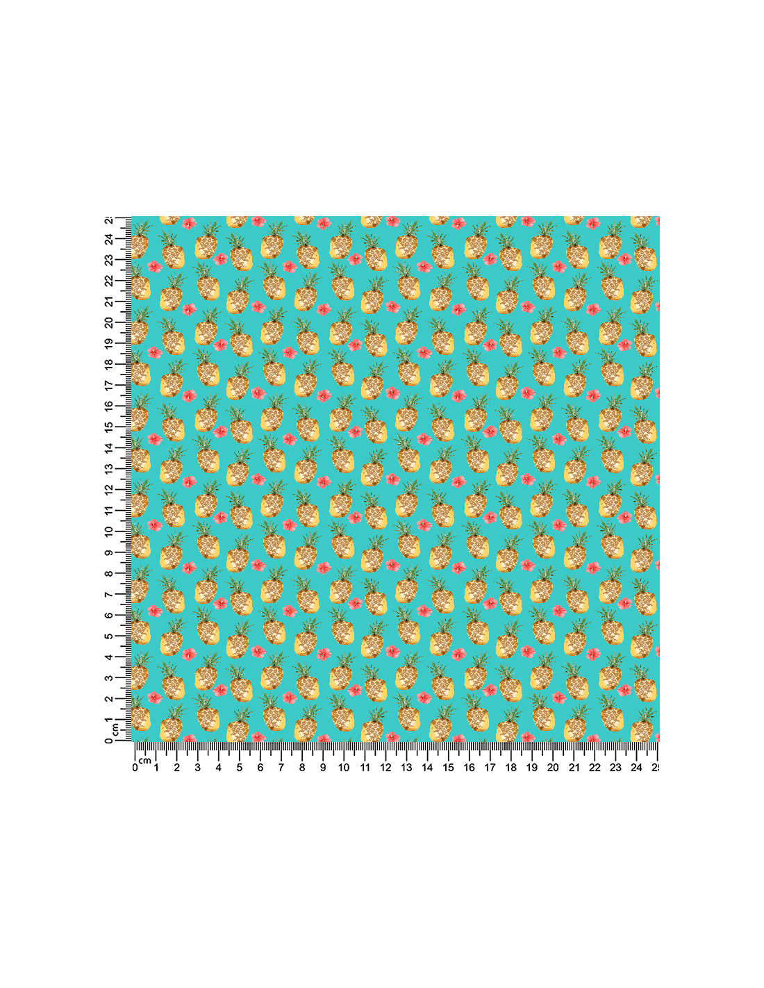 Tela estampada de piñas con flores en fondo de tela color turquesa.