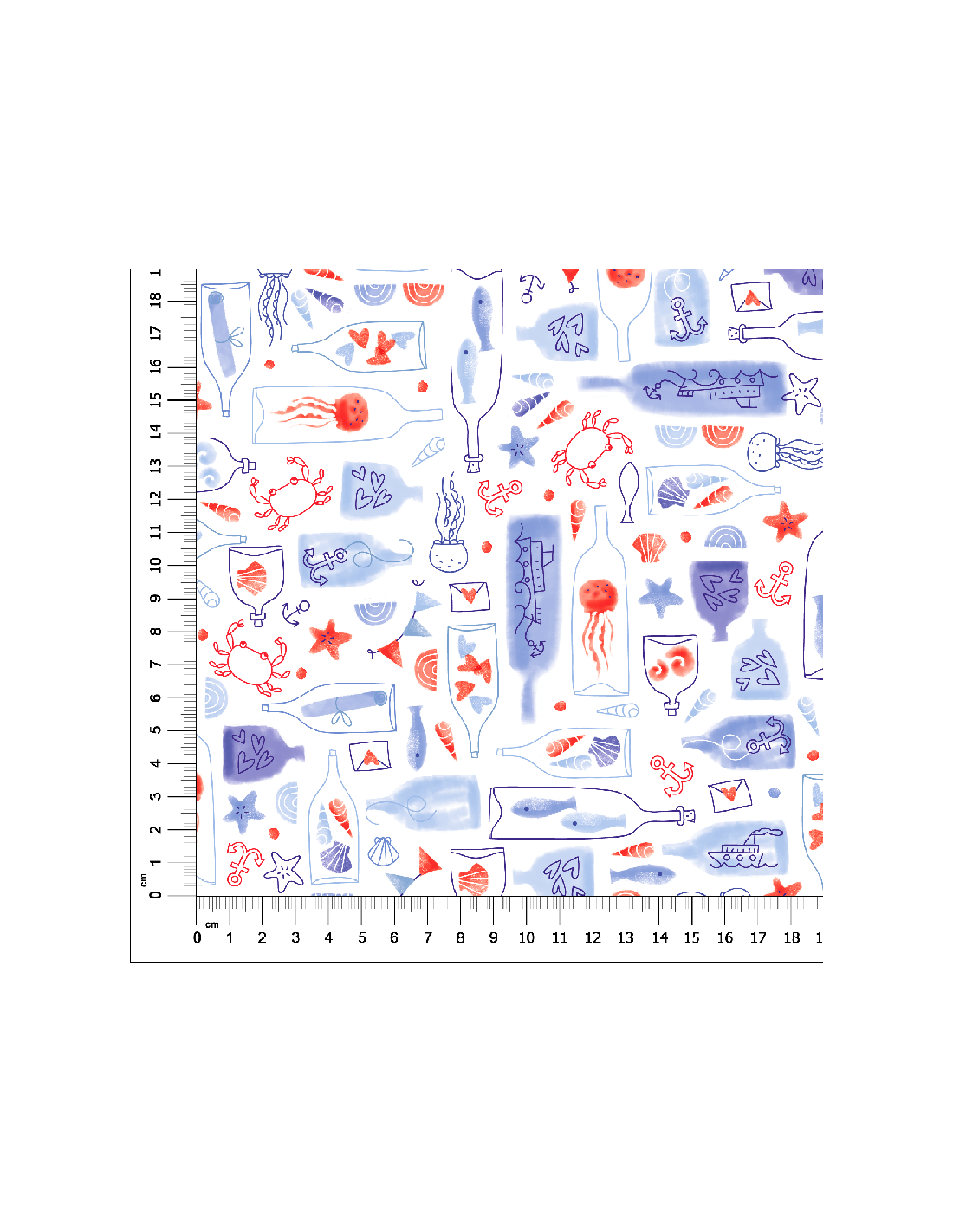 Preciosa tela estampada motivos marineros: Barcos, botellas, barcos, anclas, estrellas, conchas, corazones, cangrejos, caracolas… en colores rojo salmón y azul violáceo sobre fondo de tela blanca.