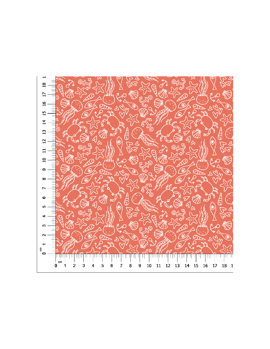Tela con estampado digital de cangrejos, conchas, medusas, anclas, cangrejos, peces, corazones…. En color blanco sobre fondo de tela color rojo salmón.
