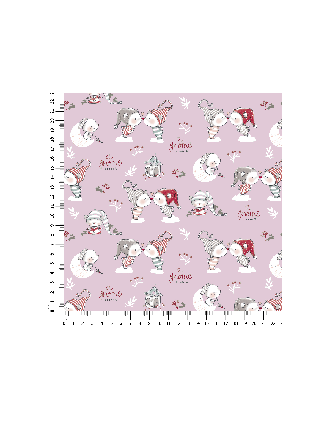 Este tecido de percal de algodão com estampa de gnomos e cogumelos transmite ternura, com um design encantador ideal para projetos infantis e têxteis decorativos.